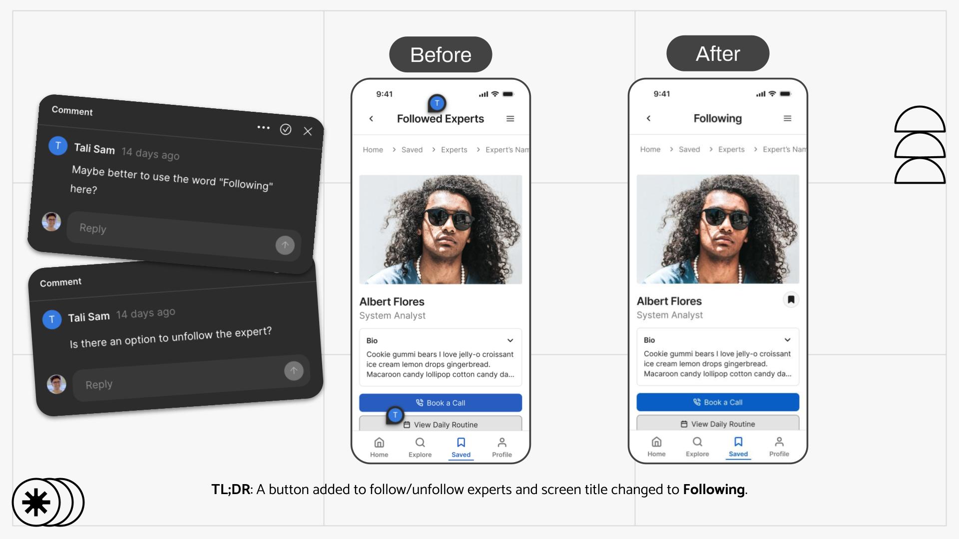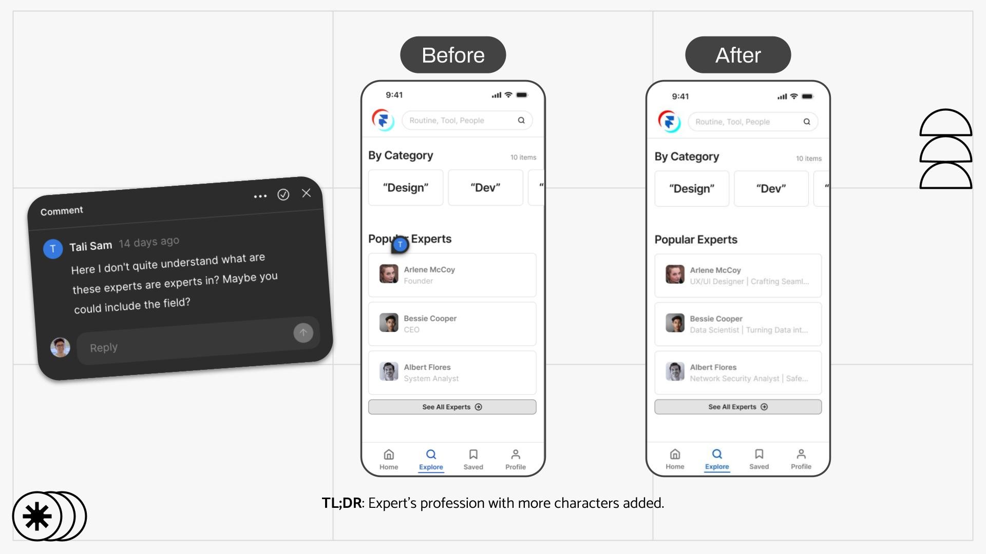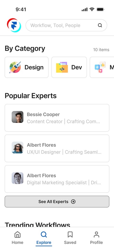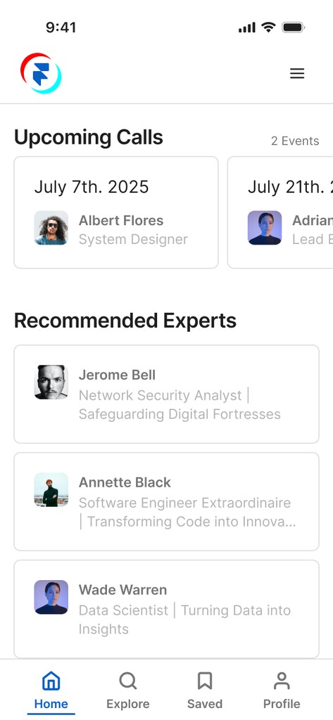 Finally, with the major usability issues resolved and a visual direction confirmed, I gathered extensive feedback on my Figma prototype from my colleague as a final touch. This review process was invaluable for polishing the design. Based on this feedback, I added more descriptive job titles to the "Popular Experts" cards to provide better context and refined my copywriting to ensure consistency.