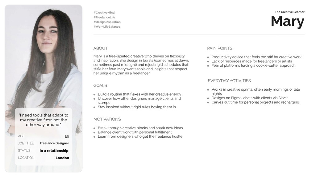 Needs to quickly learn and adapt best practices to accelerate his career.Mary, The Creative Student: